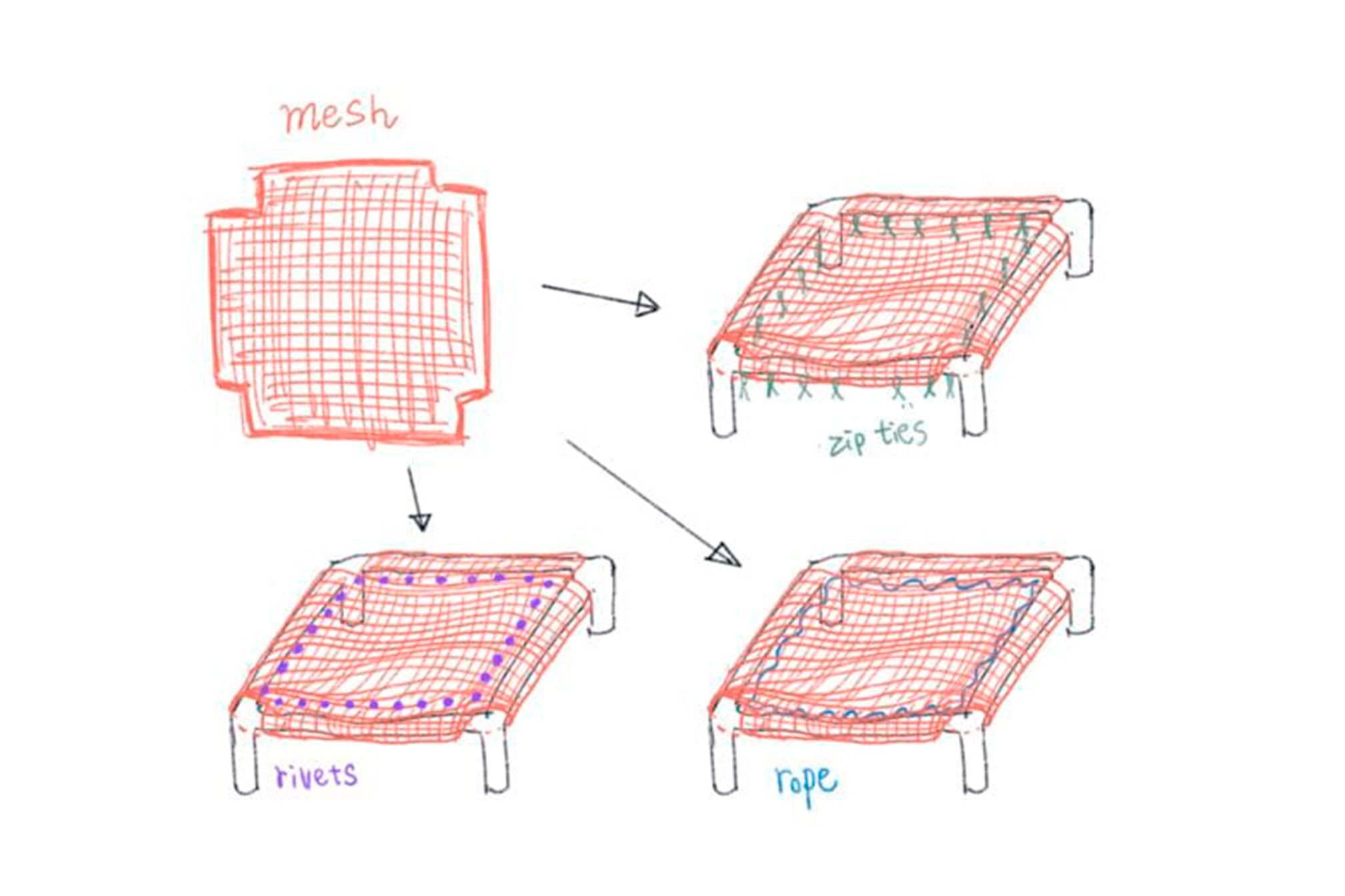 Mesh-to-Frame Attachment: This connection must be secure and efficient to assemble, using options like zip ties, rivets, or screws, ensuring stability without harsh seams that could cause discomfort.