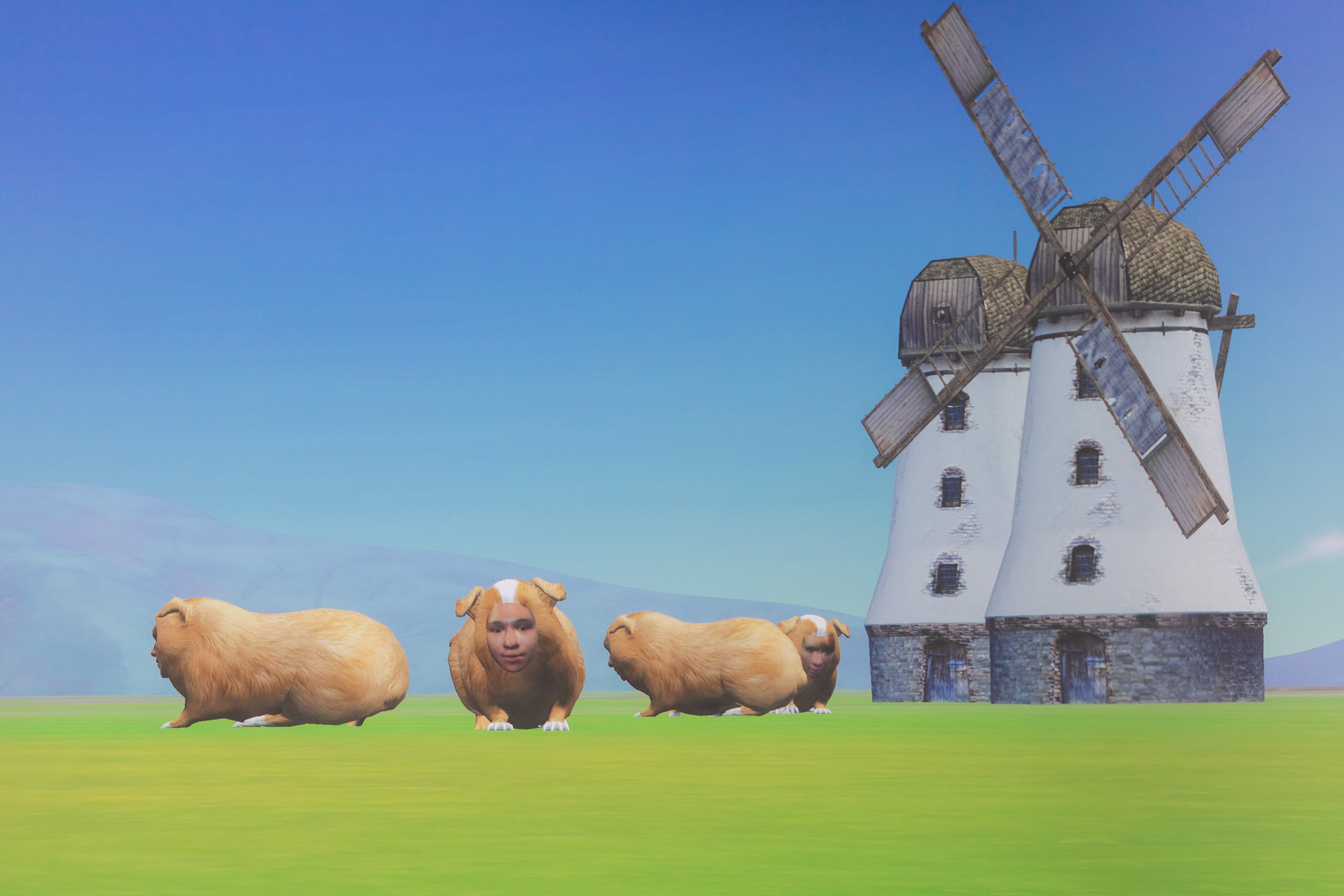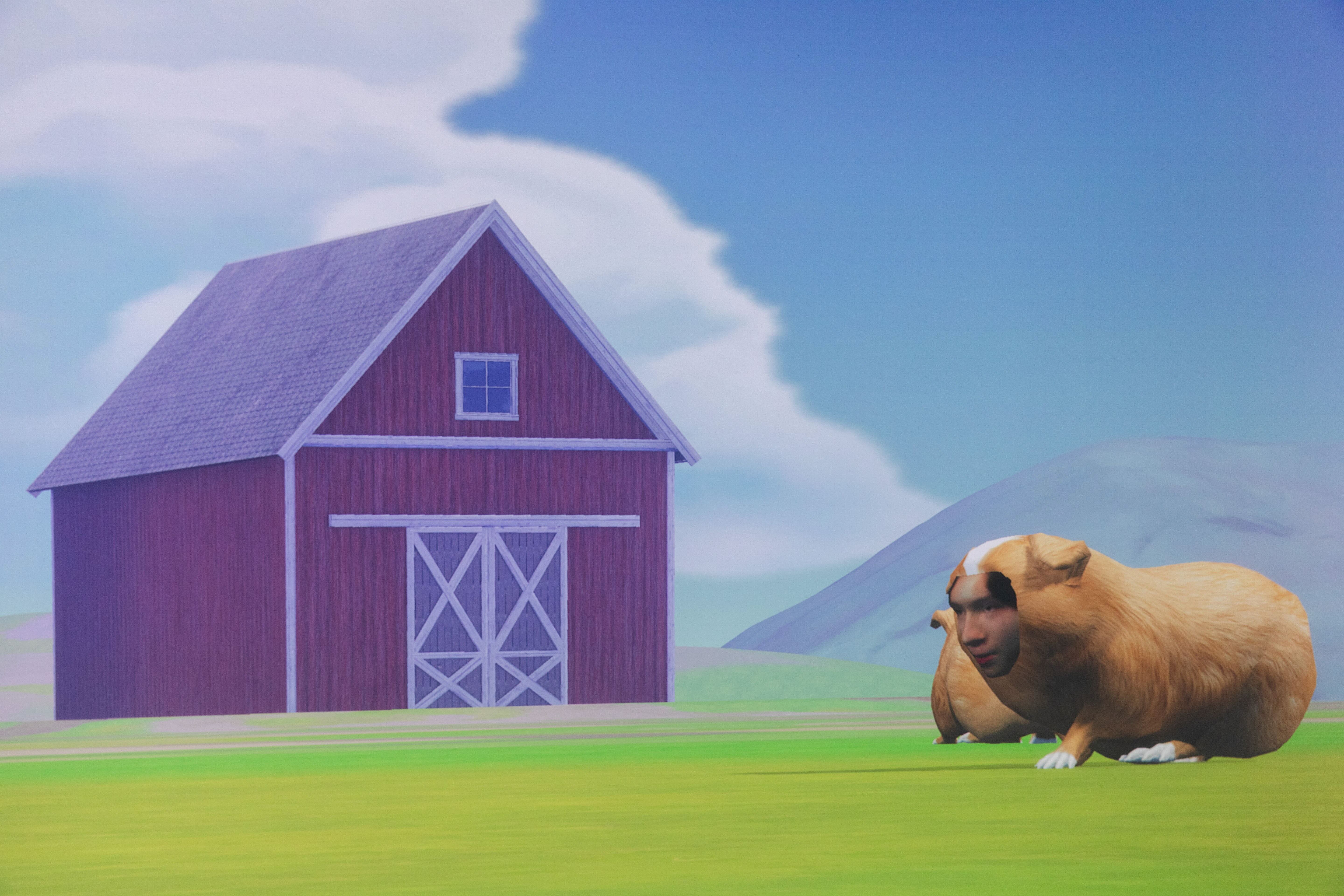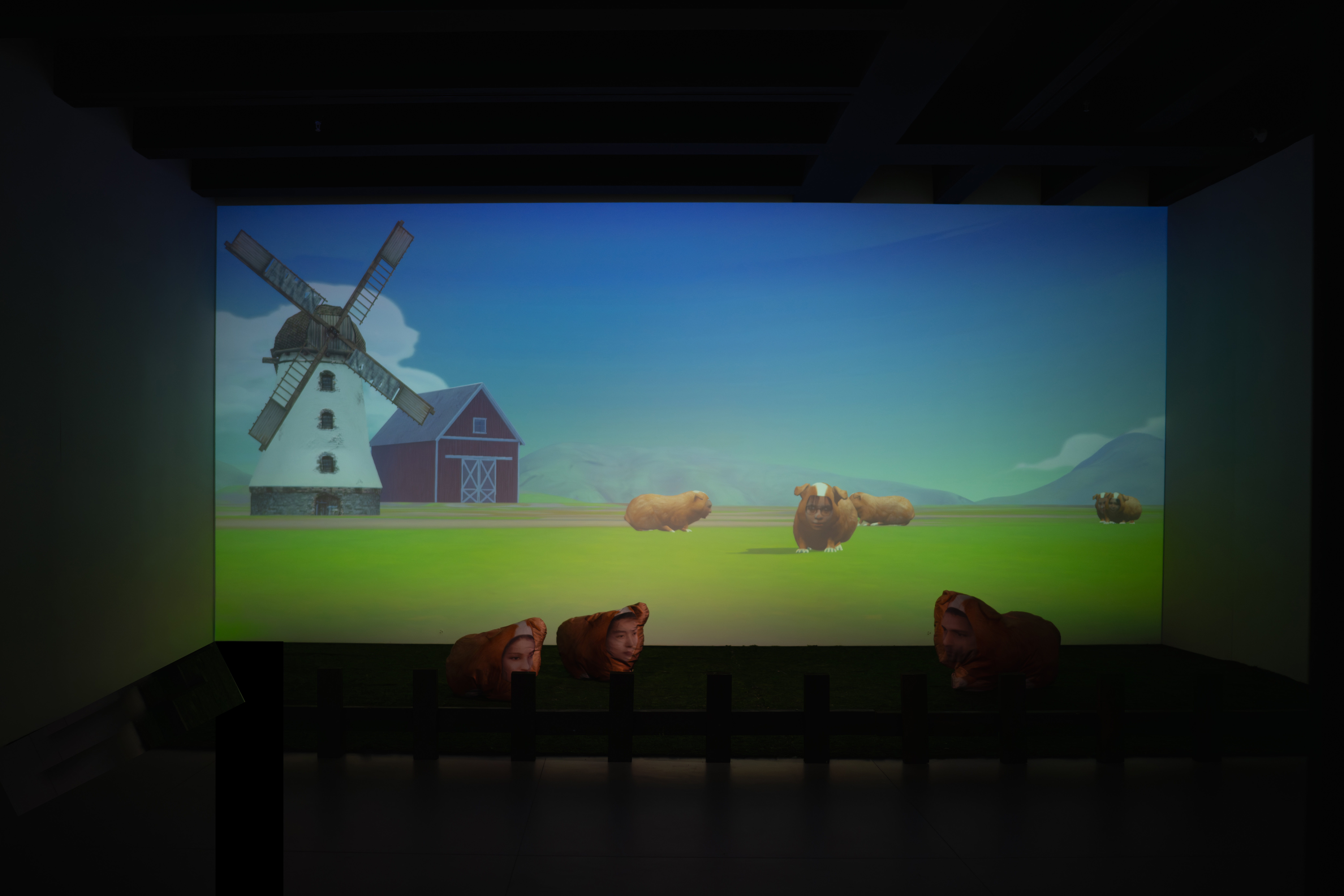 Developed over two years, the exhibition combines Ma’s sculptures, prints, and other multimedia works with a central collaboration with Ren. At its heart is The Guinea Pig Eligibility Test, an interactive, projection-mapped installation that serves as the conceptual and spatial hinge of the show. This piece invites participants to complete a questionnaire modeled after medical forms, scored to reward disclosures of social vulnerability. Those deemed “eligible” have their facial biometric data transformed into guinea pig–human hybrids, projected into a shared digital farm.