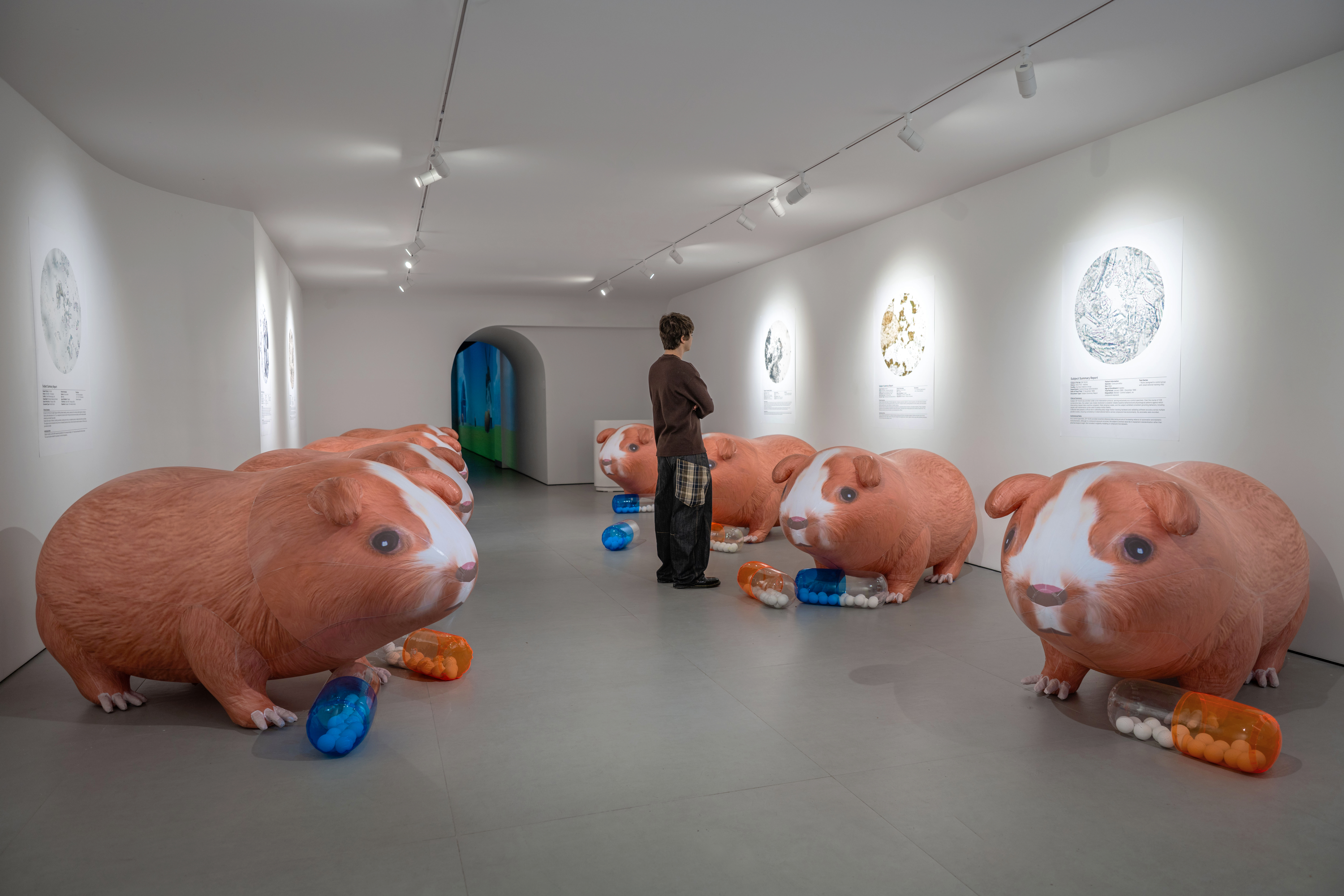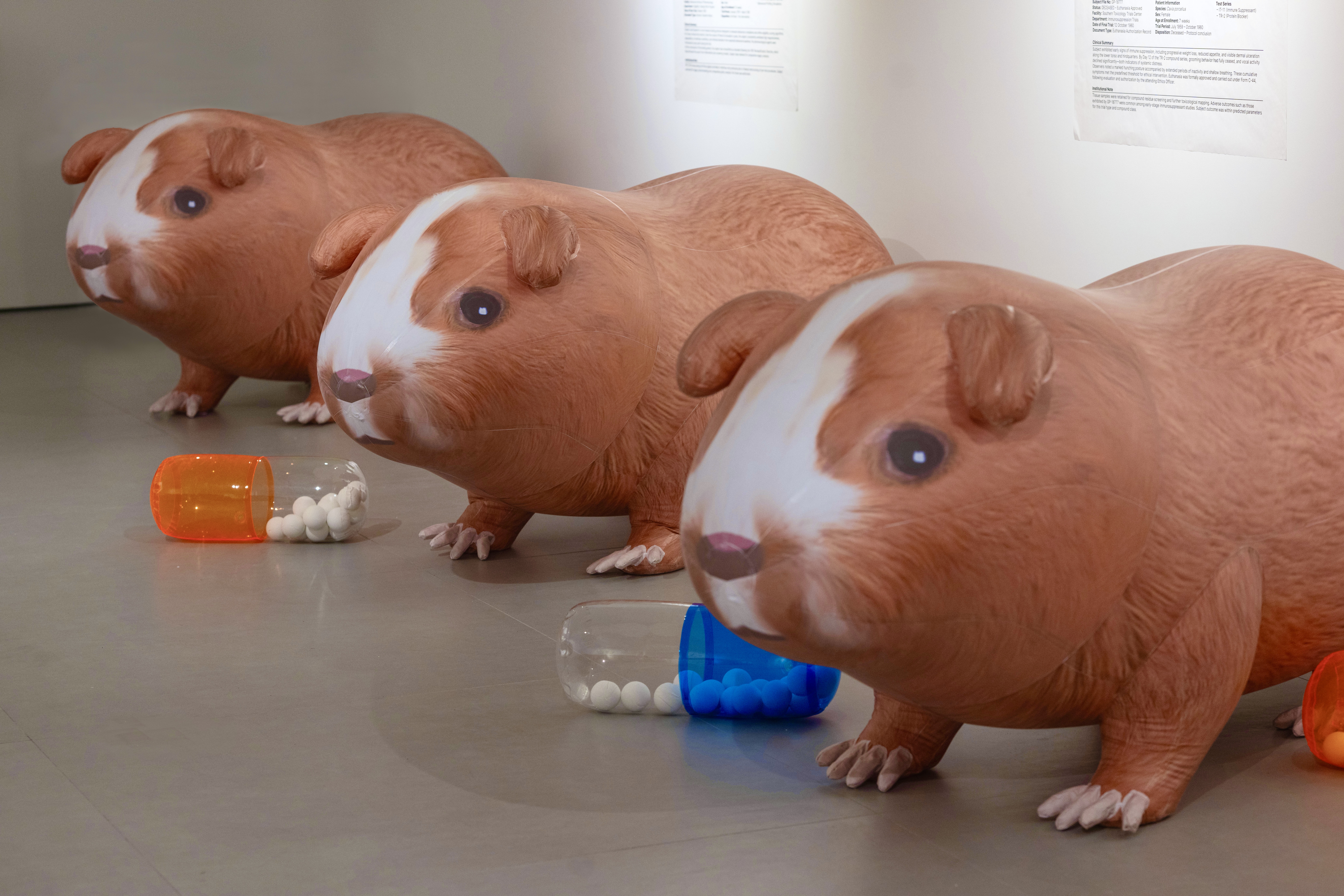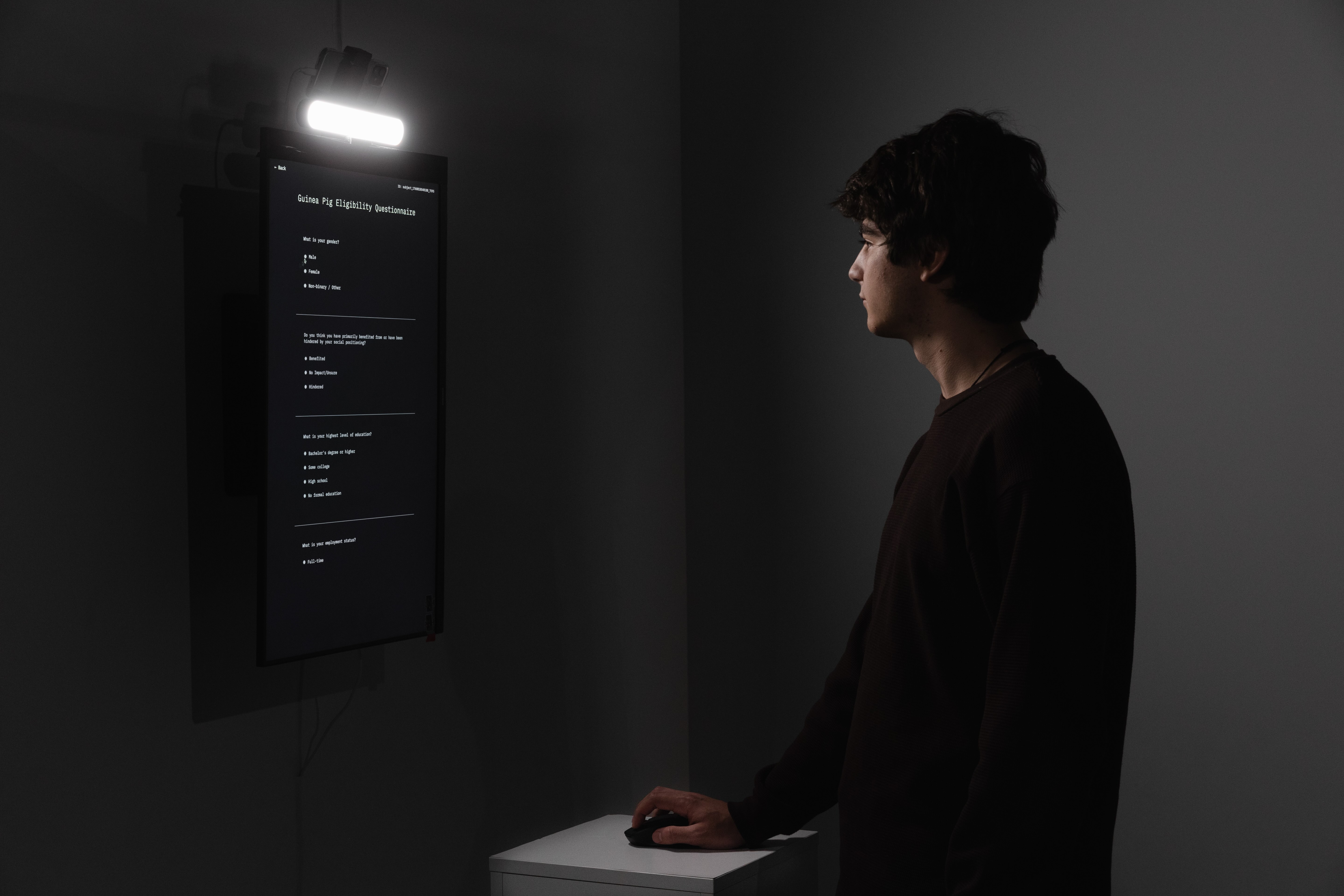 Guinea Pigs: You May Be Eligible is a multimedia exhibition that transforms visitors from observers into participants in a speculative world where the boundaries between human and animal, observer and observed, essential and inessential collapse.