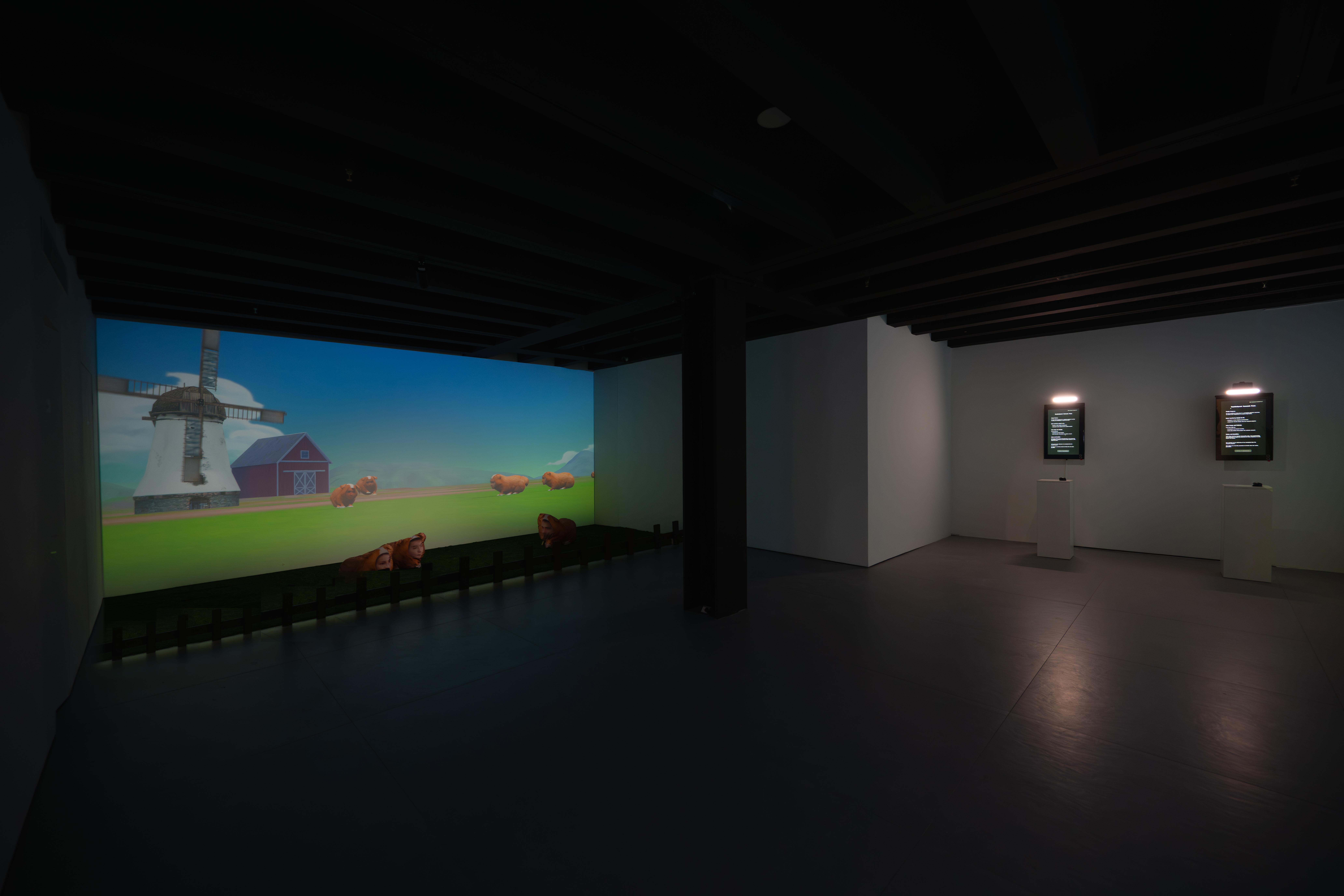 Multimedia installation, dimensions variable. Custom-built real-time interactive software with camera, screen, and mouse; projection mapping; software-generated animation; participants’ responses and facial data; soil, grass seeds, and fence.